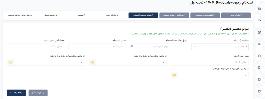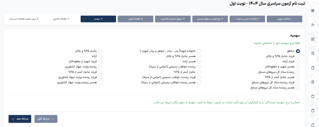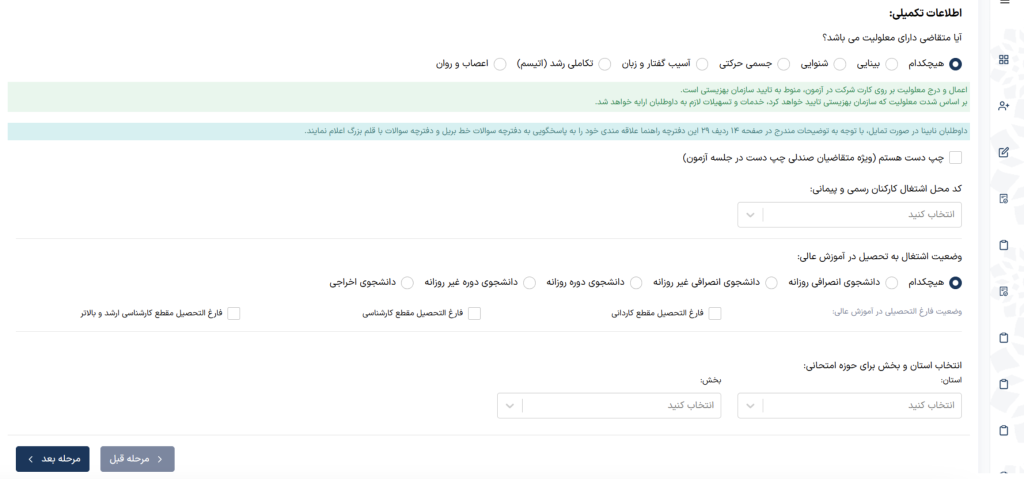 - موارد خاص مثل معلولیت، چپدست بودن یا وضعیت اشتغال را ثبت کنید و حوزه امتحانی را انتخاب نمایید.