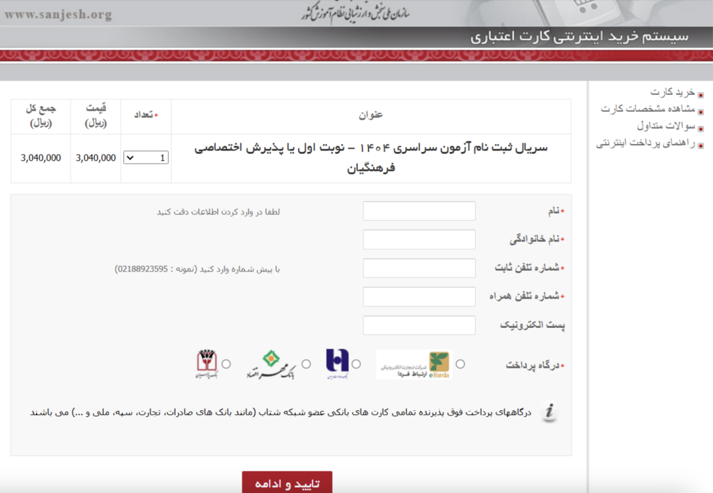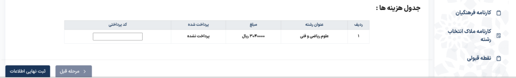 - اطلاعات را بررسی کرده و با پرداخت هزینه ثبتنام (۳۰۴,۰۰۰ تومان)، ثبتنام خود را تکمیل کنید.