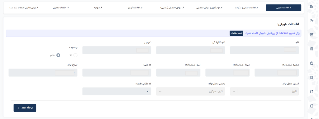 - نام و نام خانوادگی، شماره شناسنامه، کد ملی، تاریخ تولد و سایر اطلاعات شخصی را وارد کنید.