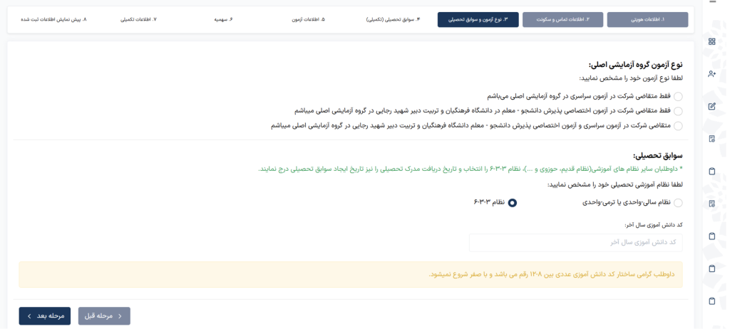 - نوع آزمون و سوابق تحصیلی (نظام ۶-۳-۳) را مشخص کنید و کد دانشآموزی سال آخر را وارد کنید.